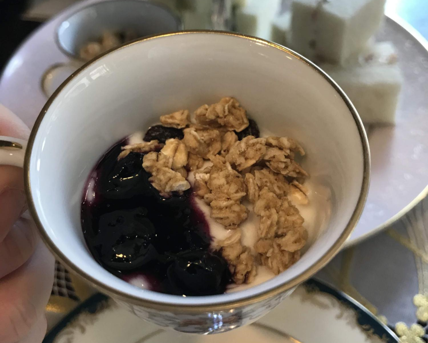 그래놀라 블루베리 요거트와 게살 샌드위치, 오이 샌드위치입니다.